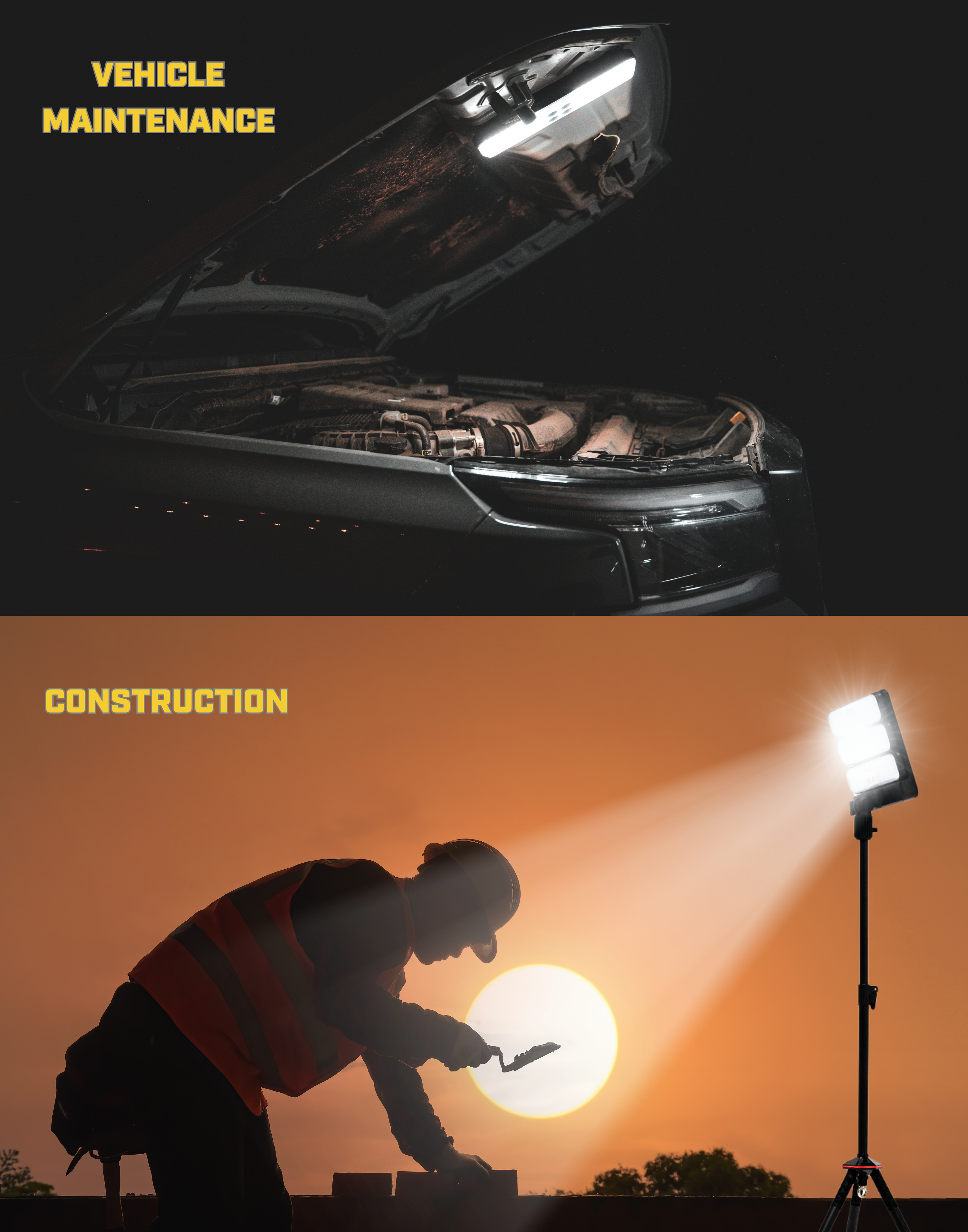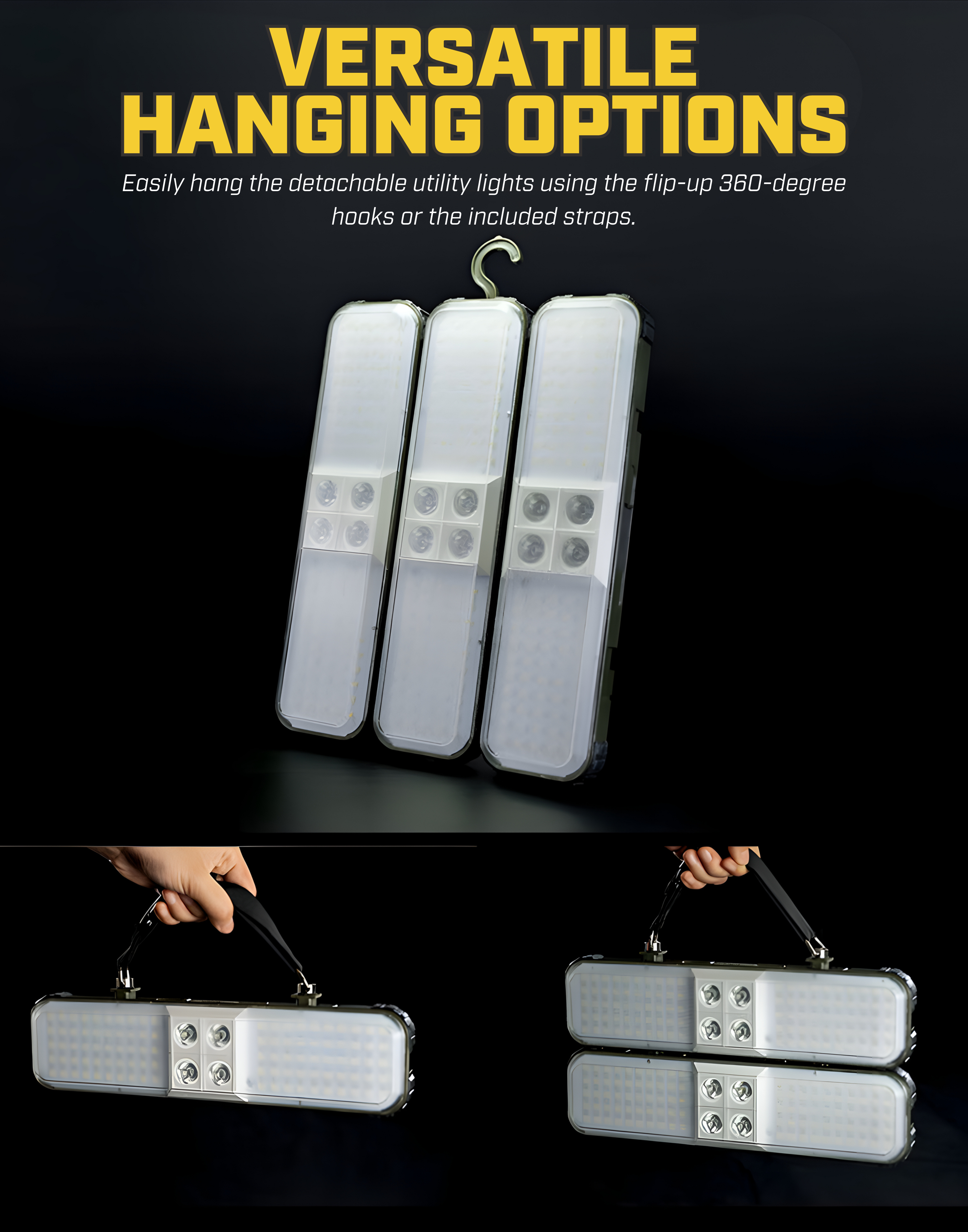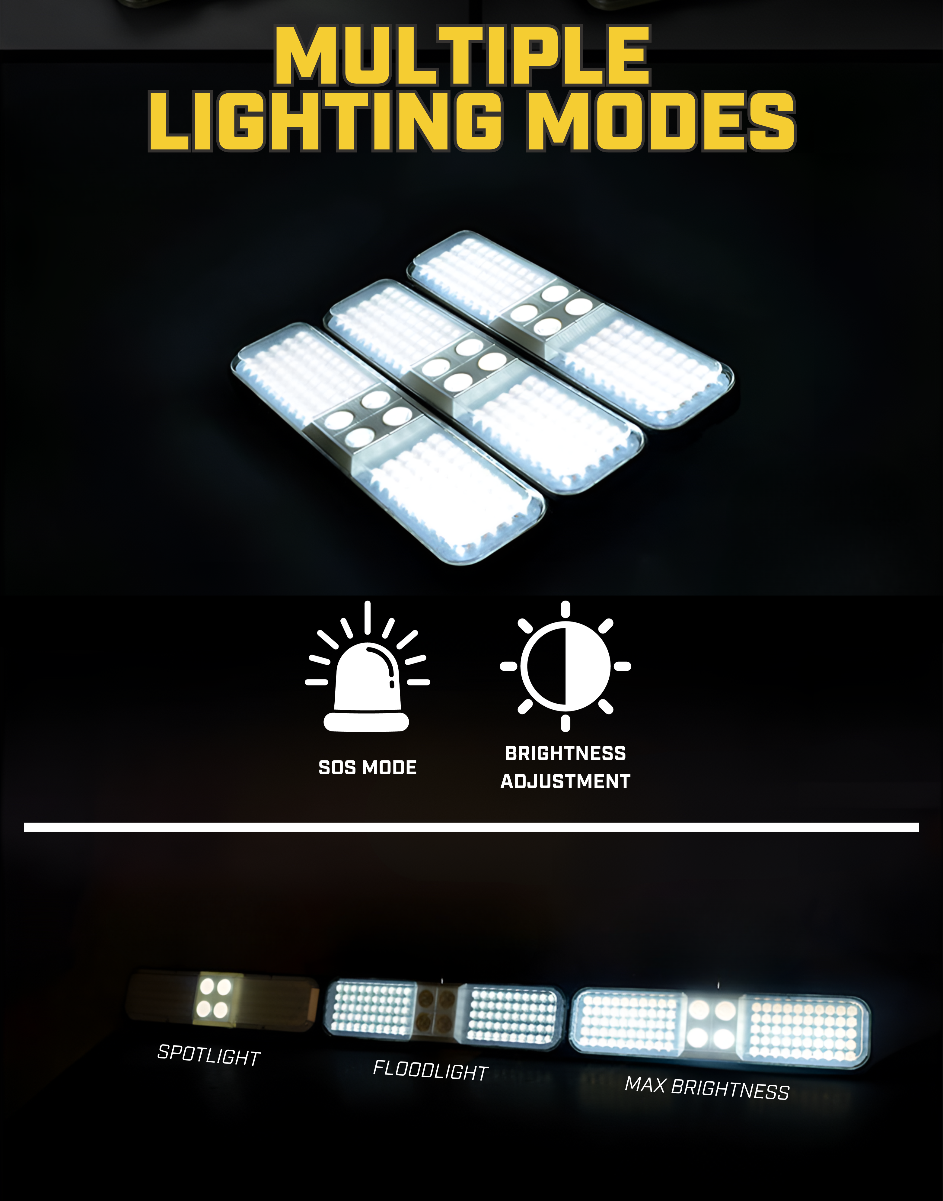 Each portable light has three modes to meet various demands: spot light mode, flood light mode, and high lumen mode.