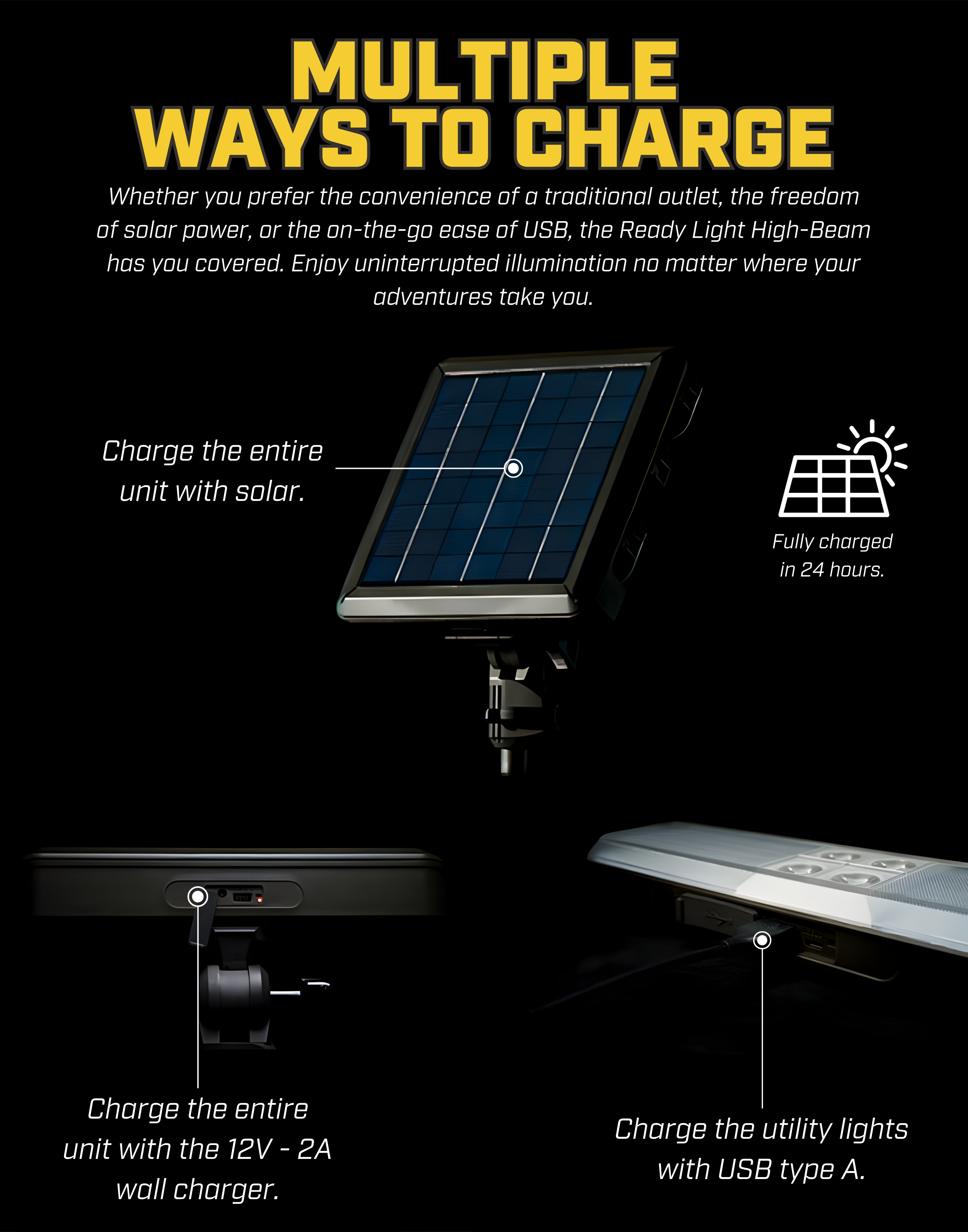 The ReadyLight High Beam is a high-power work and camp light that delivers an impressive 3,500 lumens of max brightness with a run-time of 3 to 12 hours depending on brightness level. It provides multiple charging options, allowing you to recharge using the built-in solar panel on top, or through the DC-12V port.