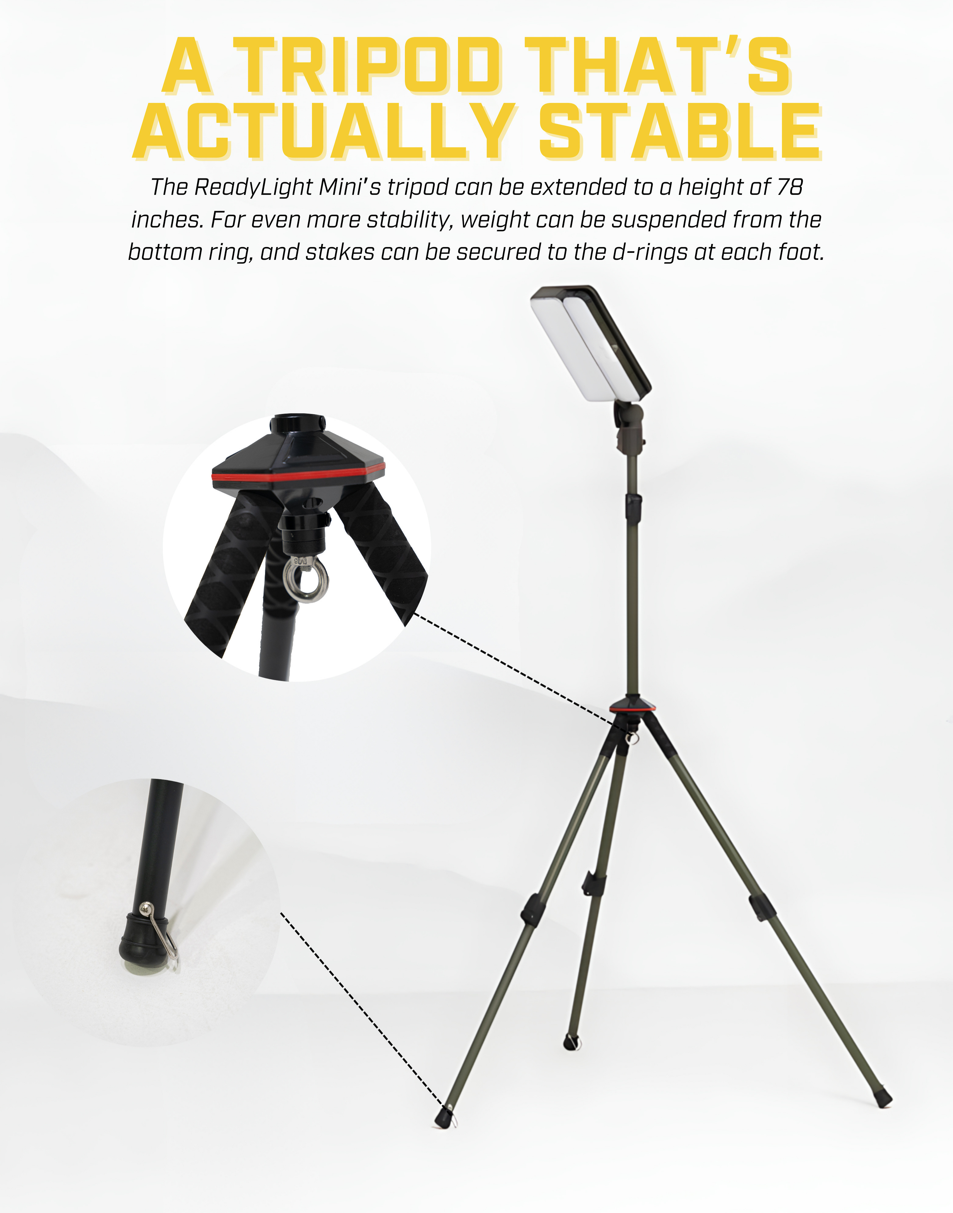 Introducing the ReadyLight Mini, your ideal lighting companion for those who prefer simplicity without sacrificing performance. While retaining the same sturdy tripod design as our other ReadyLights, the ReadyLight Mini distinguishes itself with its compact head and convenient carrying case.