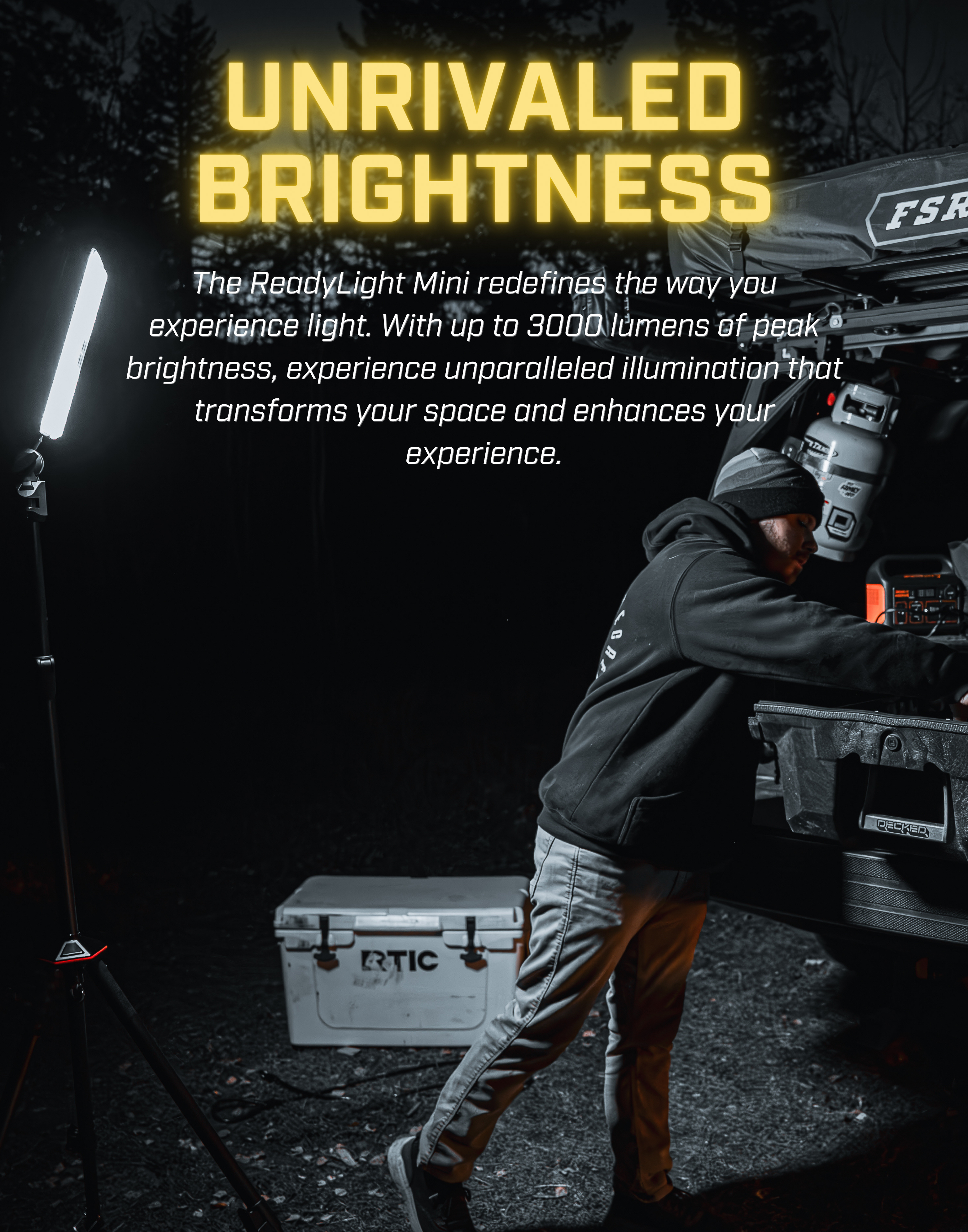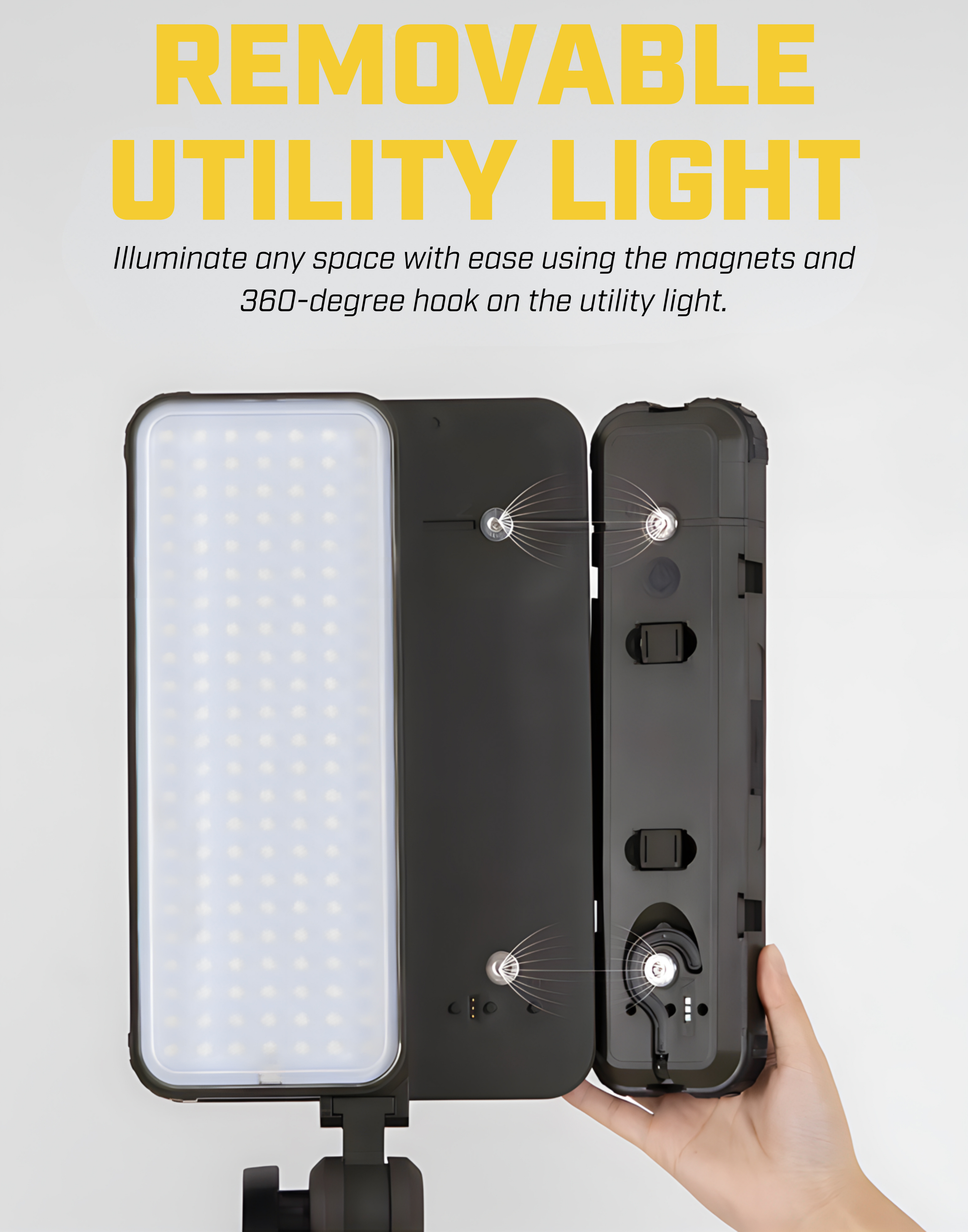The ReadyLight Mini boasts a powerful main light with an impressive output of 1600 lumens, and it comes equipped with a detachable, magnetic side light providing an additional 1400 lumens of brightness. With its high-capacity lithium-ion batteries, you can rely on this portable lighting solution for up to 11 hours on a single charge, ensuring you're never left in the dark.